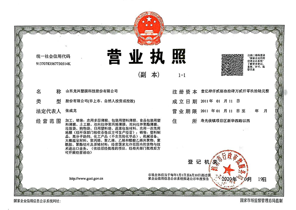 山東龍興塑膜科技股份有限公司前身為山東壽光龍興農膜有限公司組建于2011年,2018年10月重組,目前是壽光市國有控股公司、高新技術企業,是專業生產高檔農用薄膜、工業用薄膜的企業,是一家以產品制造為主,集科研開發(fā)、產品設計、技術服務于一體的綜合性企業。公司現有職工228人,各類工程技術人員97人,管理人員20余人,注冊資金14234.2096萬元,總資產102314萬元,目前是壽光市國有控股公司、高新技術企業。公司是中國塑料加工工業協會農膜專業委員會會員單位,中國復合材料工業協會會員單位,中國塑料加工工業協會雙向拉伸聚酯薄膜專業委員會會員單位...